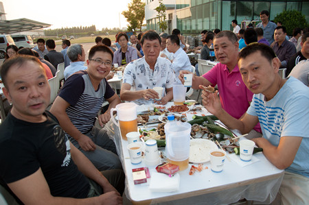 17:30,志賀進(jìn)總經(jīng)理端著酒杯,走到舞臺(tái)前,首先感謝廣大員工的辛勤努力,使公司取得很好的業(yè)績,隨著一聲“干杯”,荏原博泵第五屆納涼晚會(huì)拉開了序幕。公司380多名員工,分部門有序而坐,大家推杯換盞,興高采烈。公司領(lǐng)導(dǎo)挨桌給員工們敬酒,大家沒有了上下級(jí)的拘謹(jǐn),一派歡樂祥和的景象。
